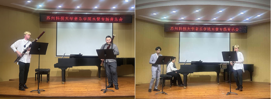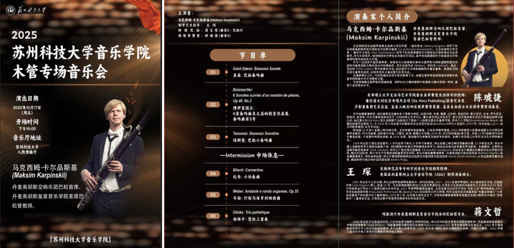 10月17日下午,丹麦奥胡斯交响乐团巴松首席Maksim Karpinskii(马克西姆•卡尔品斯基)与中国单簧管演奏家陈琥捷、青年巴松新秀蒋文哲、钢琴艺术指导王琛,共同演绎的木管专场音乐会在苏州科技大学音乐学院八教演播厅隆重举办。本场音乐会由苏州科技大学音乐学院主办。