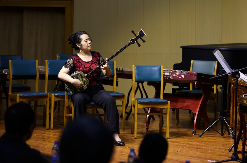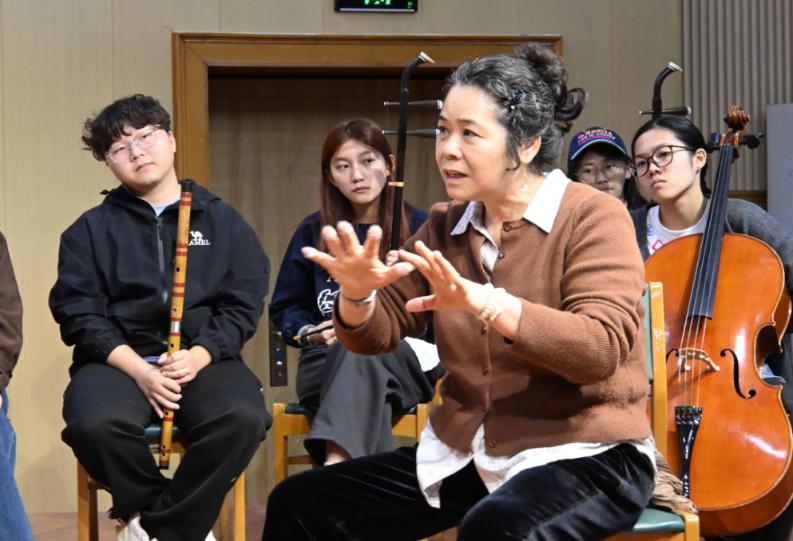 接下来徐凤霞老师的工作坊,这是一场“传统的华丽转身”。她手执三弦,一开口便是千年的风韵。但令人惊叹的是,这古老的声音并未停留在过去。《蓝天白云绿草地》的即兴创作于排练,她向我们展示了人声与古筝与小提琴仅用简单的几个和弦便融入到一起。她用乐器与我们对话。在她手中,传统不是被供奉的化石,而是充满生命力的创作源泉。最终呈现出了全新的《蓝天白云绿草地》。