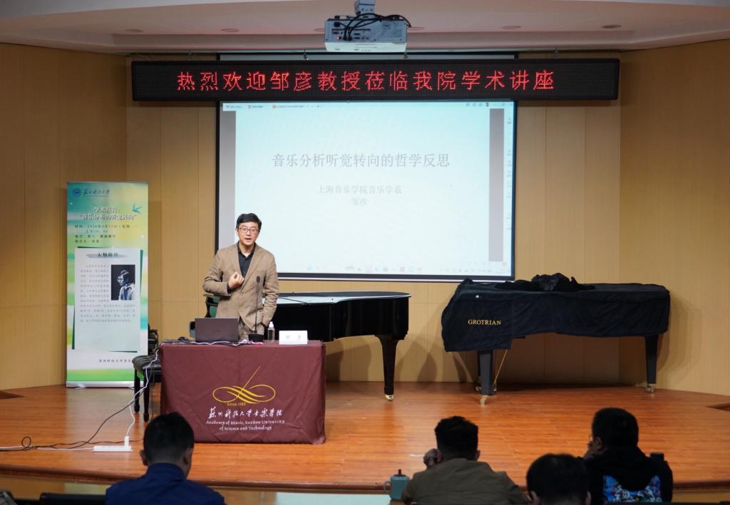 4月13日上午,上海音乐学院博士生导师邹彦教授应邀莅临苏州科技大学音乐学院,为师生做《音乐分析听觉转向的哲学反思》的学术报告。党总支书记兼院长黄祖平教授主持,部分师生参加了本次活动。