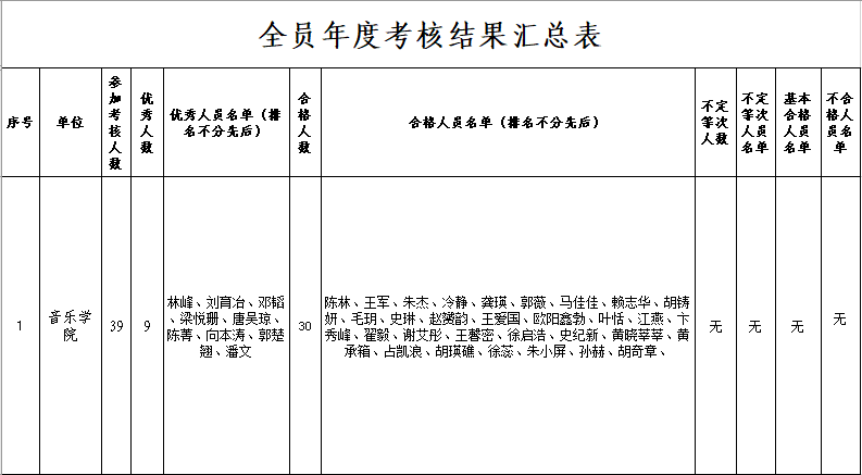 根据学校《关于做好2025年度全员考核工作》、《关于开展2025年度非年薪制人员聘期绩效考核的通知》的通知要求,音乐学院教职工2025年度考核、非年薪制人员聘期绩效考核已完成,现对考核结果予以公示: